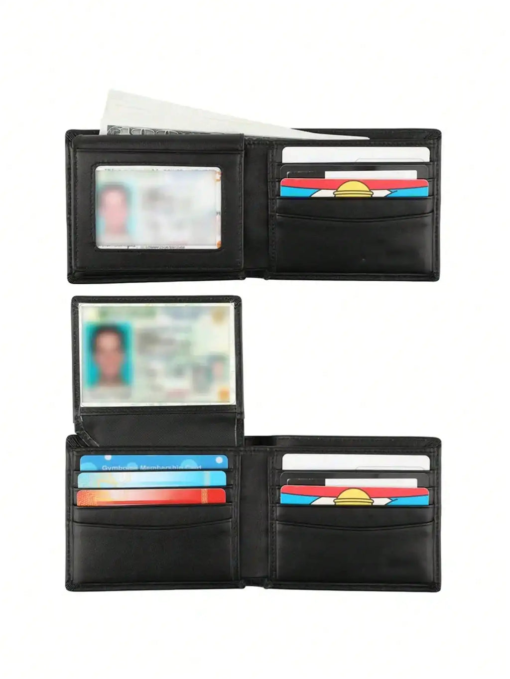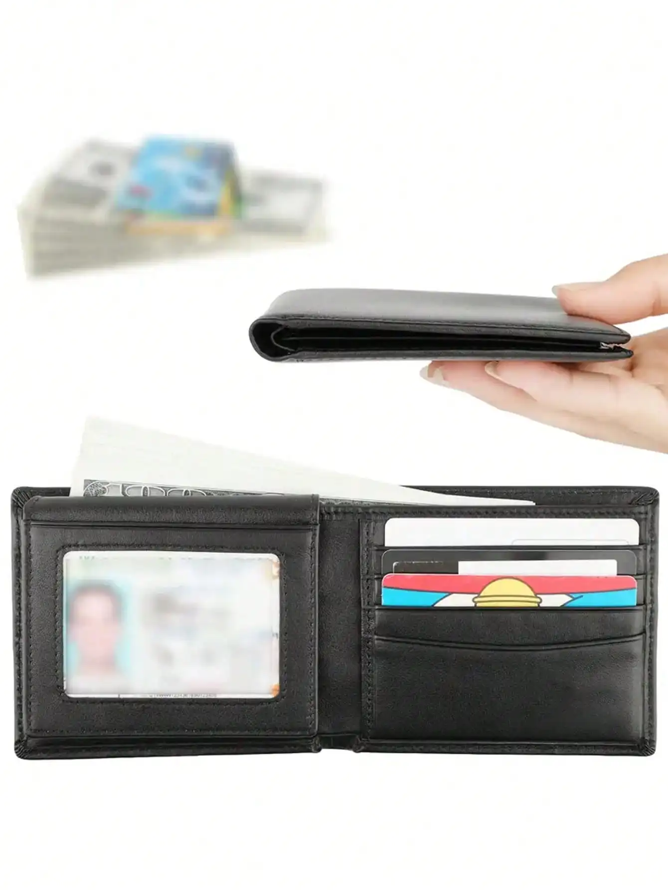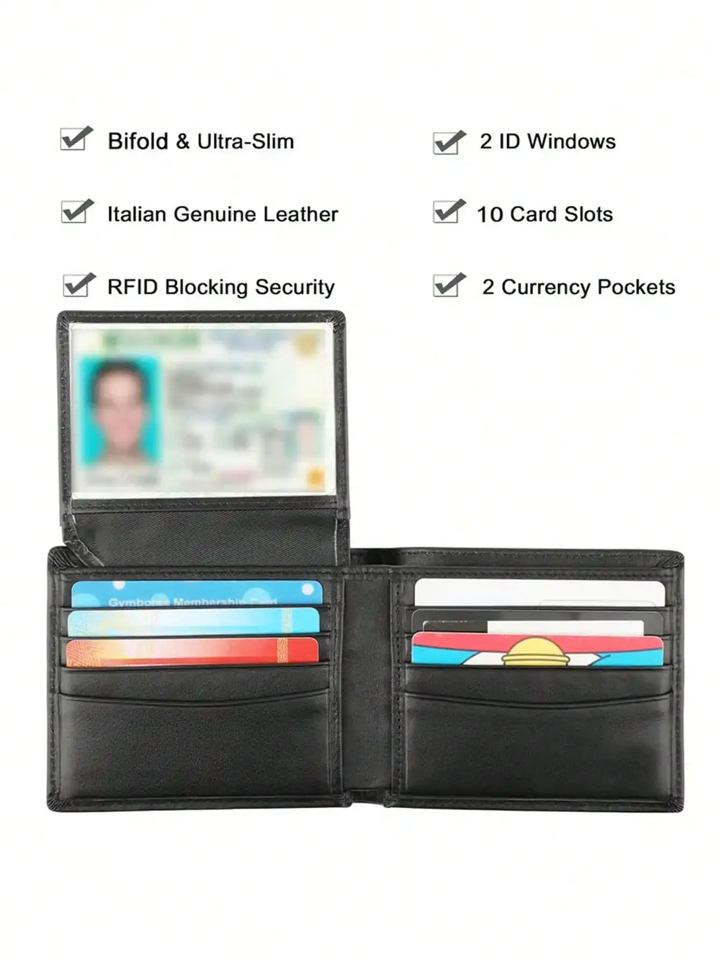 Stylish Cowhide Leather Bifold Wallet For Men - RFID Blocking & 2 ID Windows - Black